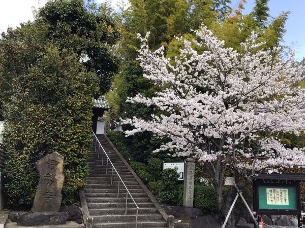 「上天神」のバス停の交差点を東に5分ほど進むと左手に石段が見えてきます。 春には石段の下の桜がきれいです。
